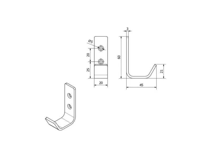 Abmessungen – Höhe 60 mm / Breite 20 mm / Tiefe 45 mm / Materialstärke 3 mm / Bohrlochabstand 20 mm
