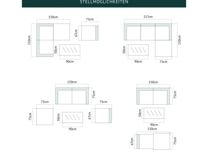 Tisch, Ecksofa, Sofa und Hocker ermöglichen verschiedene Stellmöglichkeiten für jeden Anlass