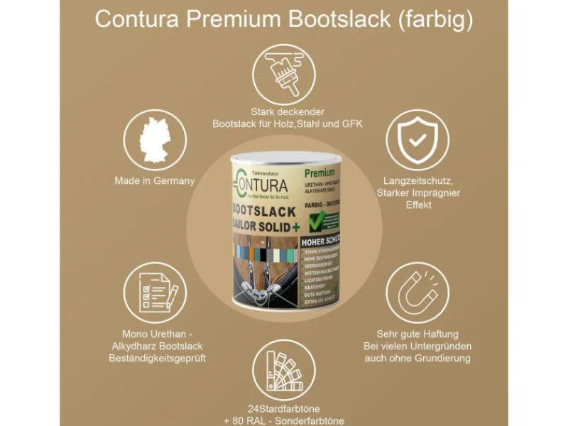 Durch den SOLID+-Härter (Mischverhältnis 1:10) wird die Oberfläche härter, strapazierfähiger und trocknet 3× so schnell wie ein 1K-System.Für Holz, Metall, GFK und PolyesterUrethanverstärkte AlkydharzbasisWitterungsbeständig und seewasserfestUniversal-Holzversiegelung für alle HolzartenAuch für Gartenmöbel und Holzbauteile im Innen- und AußenbereichBeständigkeitsprüfung / TR2023-1237Kratz- und chemikalienbeständigLichtbeständig mit UV-SchutzImprägnierend mit AbperleffektProduktüberwachung durch PartnerlaborSehr gute Haftung, keine Grundierung notwendigBeständigkeitsgeprüft nach TR2023-1237-01. (HIGH SOLID, Festkörperanteil >60%)Das Wichtigste auf einen BlickDer CONTURA Premium Bootslack Sailor Solid+ ist ein hochwertiger, urethanverstärkter Alkydharzlack für Holz, Metall und GFK. Lieferung im Set (Lack + Härter). Eigenschaften: füllend, abriebfest, schnelltrocknend, kratz-, schlag- und abriebfest. Hinterlässt eine harte, schützende Schicht, beständig gegen See- und Flusswasser. Ergebnis: belastbare, wasserabweisende, schmutzunempfindliche Oberfläche mit langer Haltbarkeit. Geeignet für Außen- und Innenbereich.Ein Premium-2K-Bootslack mit sehr guten Eigenschaften – versprochen!Aufgrund hoher Strapazierfähigkeit ideal für stark beanspruchte Oberflächen (Metall, GFK, Holz). Auch für Terrassenböden, Gartenhäuser, Möbel, Bierzeltgarnituren, Poolbereiche usw.Getestet nach DIN EN 53160 und DIN EN 12720 gegen Flüssigkeiten (Rotwein, Alkohol, Desinfektionsmittel, Essigsäure). Prüfbericht TR2023-1237: höchste Beständigkeit, keine sichtbaren Veränderungen.MengenangabenSet 550 ml = 500 ml Lack + 50 ml HärterSet 1,1 l = 1 l Lack + 100 ml HärterSet 2,75 l = 2,5 l Lack + 250 ml HärterReichweite: ca. 12–15 m²/l*