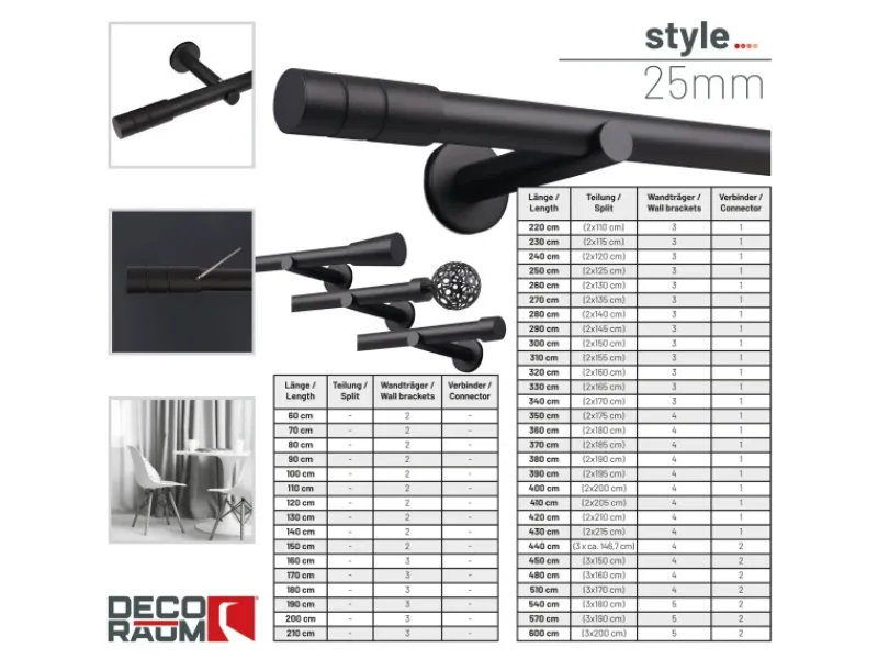 – Maßanfertigung 60–450 cm (in 10- cm-Schritten) sowie 480, 510, 540, 570, 600 cm wählbar