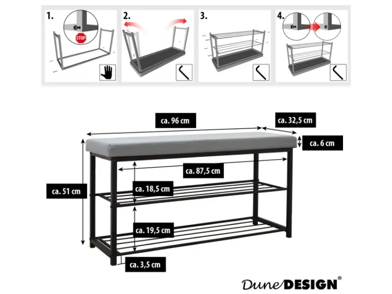 Mit ca. 32,5 cm Tiefepasst die schmale Schuhbank garantiert in jeden Flur.