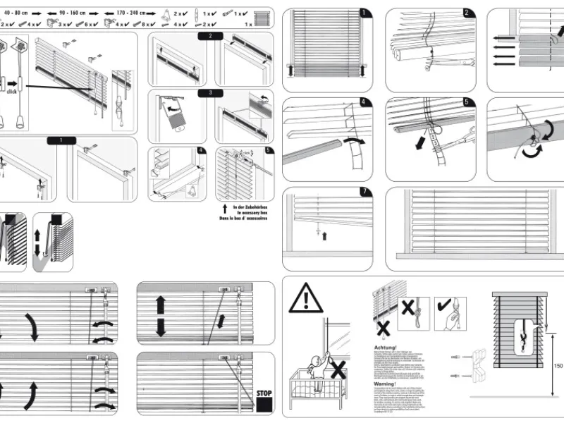 Das im Lieferumfang enthaltene Befestigungsmaterial ermöglicht Ihnen sowohl die Decken- als auch die Wandmontage. Alternativ können Sie die Jalousie mit dem passenden Klemmträger auch ohne Bohren und Schrauben montieren.