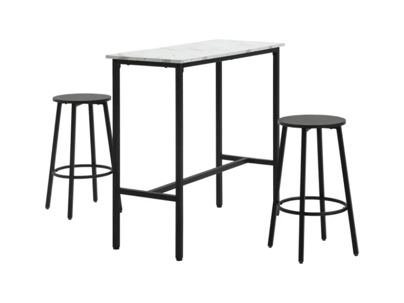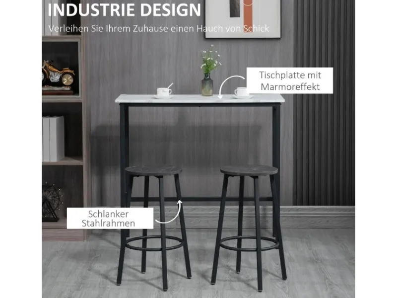 Mit diesem Bar-Set von HOMCOM können Sie zu zweit köstliche Mahlzeiten genießen und wertvolle Momente teilen. Der Küchentisch besticht durch ein elegantes pulverbeschichtetes Stahlgestell und eine faszinierende Marmoroptik. Sowohl der Tisch als auch die Stühle sind mit einer stilvollen Fußstütze ausgestattet, damit Sie beim Sitzen vollkommen entspannen können. Hauchen Sie einer beliebigen Raumecke mit diesem Set neues Leben ein, indem Sie sie in einen gemütlichen Essbereich verwandeln.