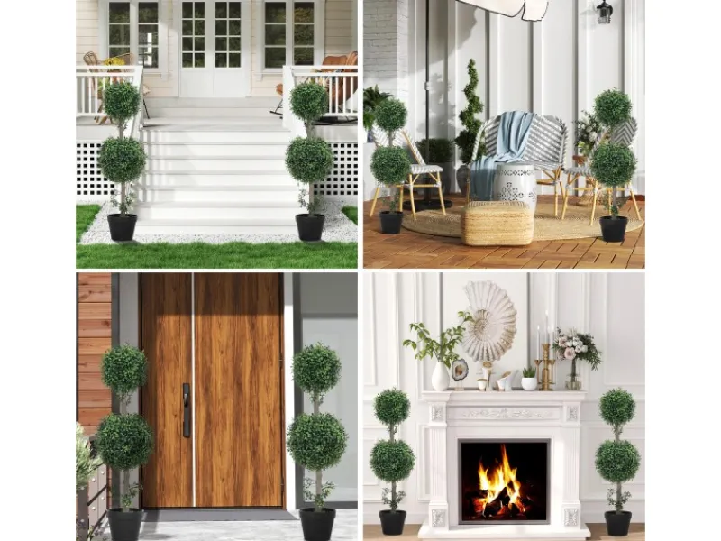 ● Set aus zwei kugelförmigen Buchsbaum-Bäumen in Topiari-Form verbessert die Raumästhetik