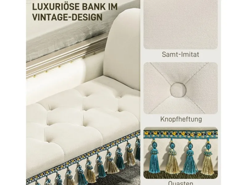 Verleihen Sie Ihrem Zuhause einen Hauch von Eleganz mit der stilvollen Sitzbank von HOMCOM. Ihr luxuriöses Vintage-Design, gekennzeichnet durch die schöne Knopfheftung und geschwungene Formen, zitiert die Ästhetik vergangener Epochen. Gefertigt aus robustem Massivholz, garantiert diese Bettbank Stabilität und Langlebigkeit. Ob als stilvolle Bettbank, Flurbank oder als praktische Schuhbank – diese Sitzbank bereichert jedes Ambiente mit ihrem charmanten Charakter.