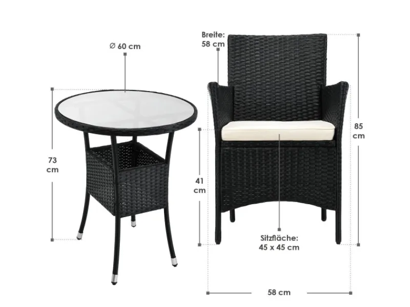 Inklusive ist ein 60 cm breiter Tisch mit einer schicken Glasplatte. Dieser bietet genügend Platz für ein gemeinsames Sonntagsfrühstück oder Cocktails am Abend. Die zugehörige Glasplatte ergänzt sich perfekt mit der geflochtenen Rattan-Optik. Das hochwertige Material sorgt zusammen mit den Querstreben für eine hohe Standfestigkeit.