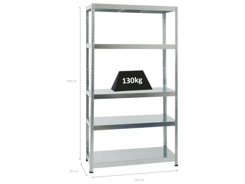 Das Schwerlastregal ist 180 cm hoch, 100 cm breit und 40 cm tief. Die Farbe ist Verzinkt