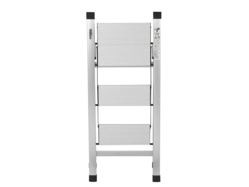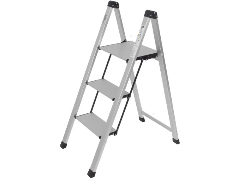 Die glatten Aluminium-Oberflächen ermöglichen eine angenehme Handhabung. Die rutschfest profilierte Trittfläche bietet maximale Standsicherheit. Gummierte Anti-Rutsch-Füße verhindern Wegrutschen und schonen empfindliche Böden. Der 3-stufige Klapptritt lässt sich zudem nach Gebrauch im Handumdrehen zusammenklappen und platzsparend verstauen: Mit einer Breite von nur ca. 5 cm passt der Alutritt hinter Türen und in schmale Nischen.