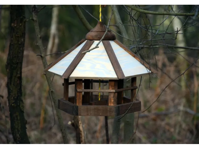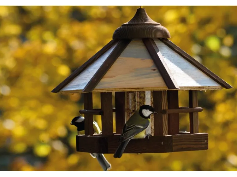 Das im traditionellen Baustil gehaltene Vogelhaus ist aus langlebigem, witterungsbeständigem Kiefernholz aus europäischer Forstwirtschaft gefertigt und ist mit einer farbigen Lasur versehen. Das massive, überstehende Dach und ein Futtersilo aus hochwertigem Acrylglas schützen das Futter im Inneren des Futterspenders vor Regen und Schnee.