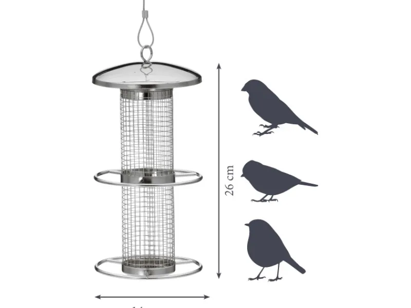 Mit dem mitgelieferten Edelstahlseil kann der Futterspender problemlos im Garten oder auf dem Balkon aufgehängt werden – sei es an Bäumen, Sträuchern oder Hauswänden. Zwei Anflugringe und das Metallgitter bieten gleichzeitig mehreren hungrigen Wildvögeln Platz und verhindern mögliche Streitigkeiten an der Futterstelle.
