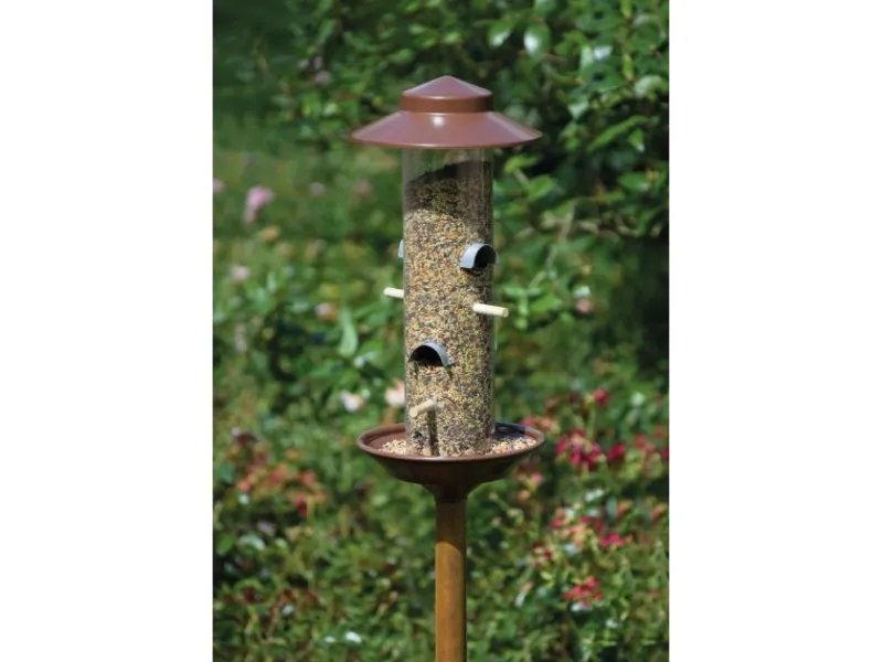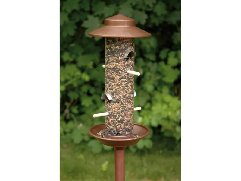 Die Futterstation verfügt über vier Anflugstangen sowie vier Futteröffnungen und kann deswegen von mehreren gefiederten Besuchern gleichzeitig angeflogen werden. Am Boden des Futterautomaten ist darüber hinaus eine Körnerschale installiert, die als Futterauffangbehälter und weitere Landemöglichkeit dient. Die Futtersäule wird auf dem mitgelieferten Ständer aus robustem Monterey-Kiefernholz montiert und kann an den verschiedensten Orten im Garten in bequemer Sichthöhe aufgestellt werden. Der Ständer ist spitz zulaufend und wird in den Boden gesteckt.