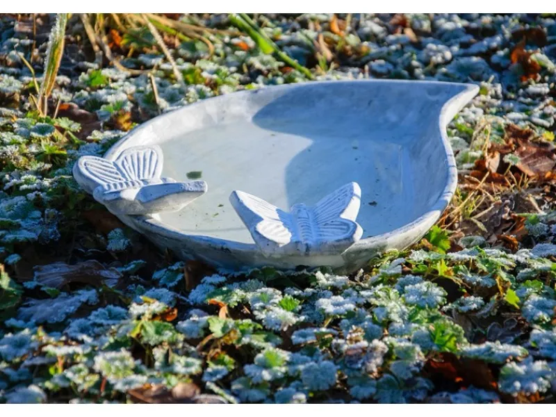 Ein regelmäßiger Austausch des Wassers sowie die Reinigung der Schale sind zu empfehlen, um Krankheiten vorzubeugen. Auch wenn keine Badegäste in Sicht sind, ist die Vogeltränke ein schöner Anblick. So macht das antik anmutende Äußere die Wasserstelle zu einem dekorativen Gestaltungselement für den Garten und zwei Deko-Schmetterlinge auf dem Rand der Wasserschale setzen einen weiteren auffälligen optischen Akzent.