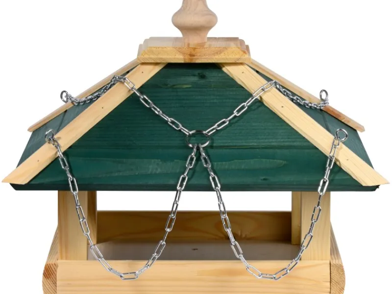 Dach ist grün lasiert und schütz das Vogelfutter zuverlässig vor Regen