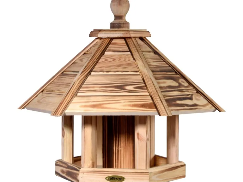 Das robuste Vogelfutterhaus „Brillo“ mit sechseckiger Grundfläche ist ein bewährter Klassiker wenn es um die Vogelfütterung geht. Die geflammte Oberfläche verbessert die Wetterbeständigkeit der Futterstelle und sorgt für ein ansprechendes, rustikales Äußeres. Das Vogelhaus eignet sich hervorragend, um Körner und lose Sämereien anzubieten und viele einheimische Wildvögel in Ihren Garten zu locken. Dabei schützt das hölzerne Futtersilo das Vogelfutter im Inneren zuverlässig vor Regen und Verschmutzung. Die Befüllung erfolgt durch die abnehmbare Spitze der Futterstation. Das Vogelhäuschen kommt am besten zur Geltung, wenn es auf einen Ständer montiert wird, z.B. auf den zugehörigen Vogelhausständer 33315FSCe von dobar. Die Futterstelle besteht aus FSC-zertifiziertem Kiefernholz (Pinus sylvestris, Hauptholzart) und nachhaltiger Forstwirtschaft. Die Herstellung in europäischer Produktion erfolgt in Handarbeit mit Fokus auf bester Qualität in der Verarbeitung. Die Außenmaße der Vogelfutterstation sind ca. 45 x 45 x 47 cm (L x B x H).