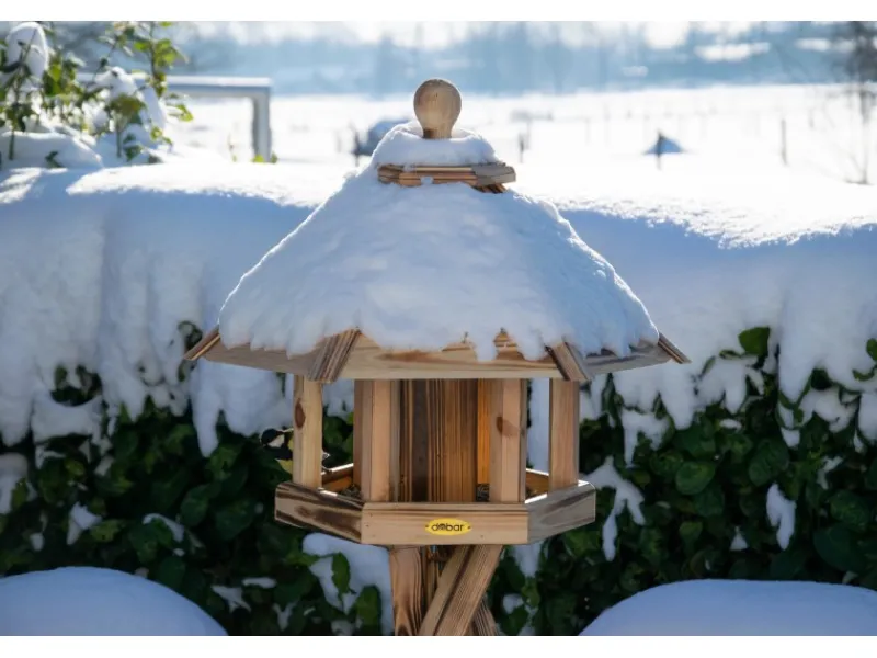 Das hölzerne Futtersilo im Inneren schützt das Vogelfutter zuverlässig vor Regen und Verschmutzung