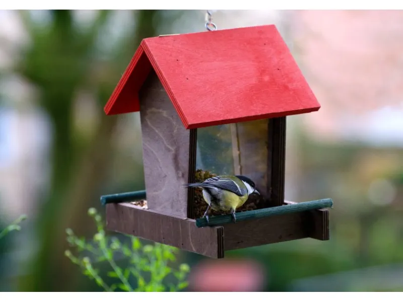 Das Vogelfutterhaus besteht aus FSC®-zertifiziertem Kiefernholz aus nachhaltiger Forstwirtschaft