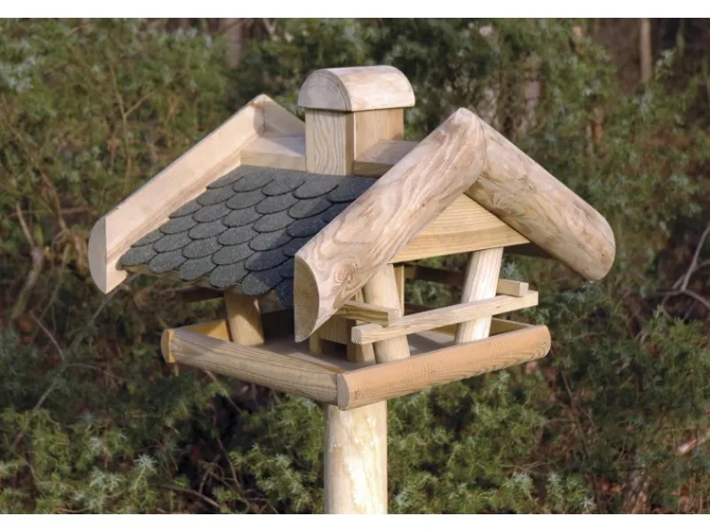 Das klassische Vogelhaus mit Rundholzverbindungen und Holz-Futtersilo mit abnehmbaren Deckel ist hauptsächlich aus hochwertig imprägniertem EU-Kiefernholz gefertigt. Das Dach ist traditionell mit dunkelgrünen Bitumen-Schindeln gedeckt.