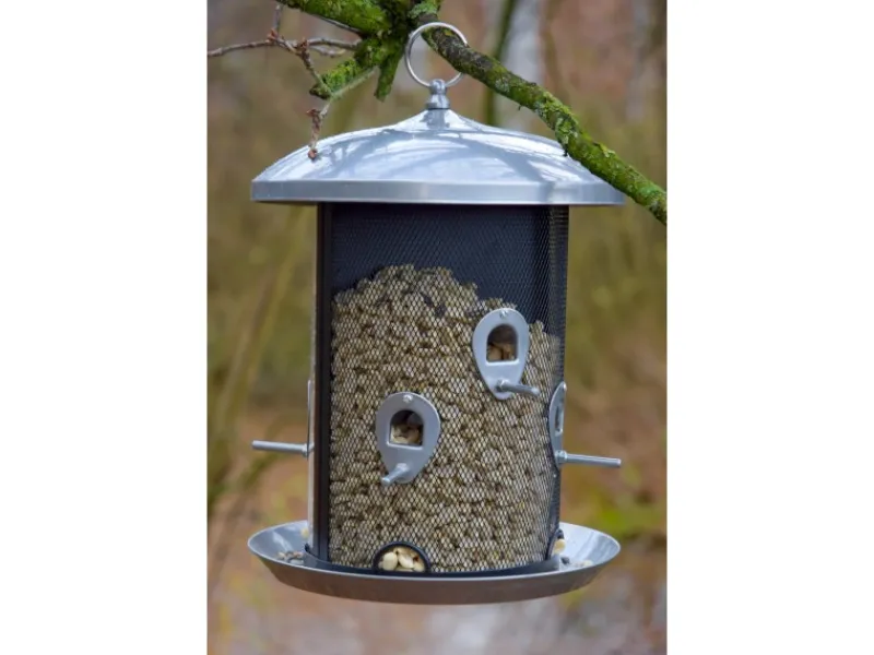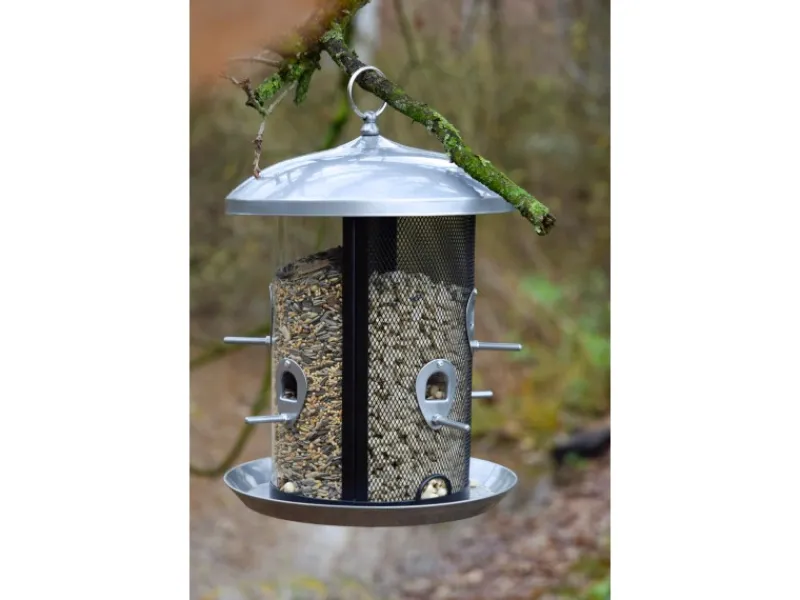 Der robuste und wetterfeste Futterspender besteht aus beschichtetem Metall und hat ein in zwei separate Kammern unterteiltes Futtersilo. Dies gibt Ihnen die Möglichkeit vielfältige Arten von Vogelfutter anzubieten. Während sich die Seite mit der UV-beständigen Acrylglasröhre hervorragend für die Fütterung mit Körnern und losen Sämereien eignet, ist die Seite mit der Gitterröhre ideal für die Fütterung mit Nüssen und Kernen. Das Vogelfutter ist dabei durch ein großes, abnehmbares Dach vor Regen und Verschmutzung geschützt. Das große Futtertablett fängt herunterfallendes Futter auf und verfügt über Abflusslöcher, die dafür sorgen, dass Regenwasser wieder abfließt. Sechs Futteröffnungen mit Anflugstangen bieten Halt für mehrere hungrige Wildvögel und verhindern, dass es zu Streitigkeiten an der Futterstelle kommt. Mithilfe der Metallöse kann der Futterspender überall im Garten und auf dem Balkon aufgehängt werden, z.B. an Bäumen und Hauswänden.