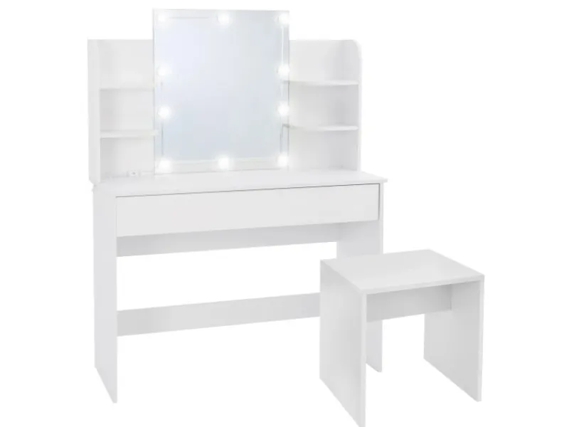 Der moderne Schminktisch von ECD Germany mit LED-Beleuchtung ist die perfekte Ergänzung zum Schminken und Stylen. Die Oberfläche des Kosmetiktisch aus weißer MDF-Holz ist kratzfest und besonders pflegeleicht. Er bietet dank seiner Fächer und der integrierten Schublade zahlreiche Aufbewahrungs- und Ablagemöglichkeiten. Der große Spiegel und die LED-Beleuchtung bieten viel Komfort beim täglichen Stylen und Schminken.