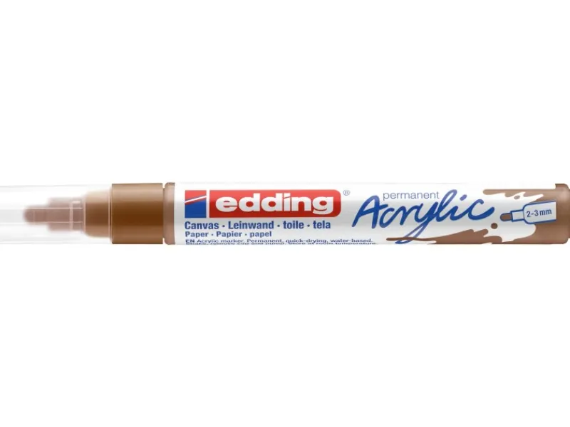 Der Edding 5100 Acrylmarker medium zum Malen auf hellen oder dunklen Oberflächen ist ideal für Materialien wie Leinwand oder Malpapier. Die Rundspitze hat eine Strichbreite von 2 – 3 mm. Die hochwertige pigmentierte Acrylfarbe auf Wasserbasis ist deckend, lichtbeständig, geruchsarm und nach dem Trocknen permanent. Die Farbe Haselnuss ist stark deckend.