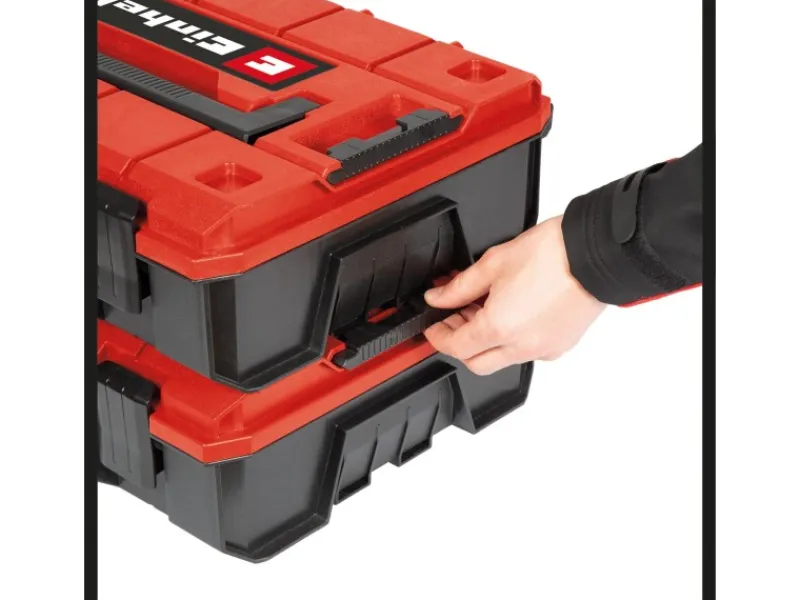 Ein praktisches Verriegelungssystem für die Verbindung gestapelter Koffer sorgt für eine geordnete, sichere Lagerung und einen einfachen Transport. Durch die spezielle Bauweise können die Koffer auch im gestapelten Zustand geöffnet werden.