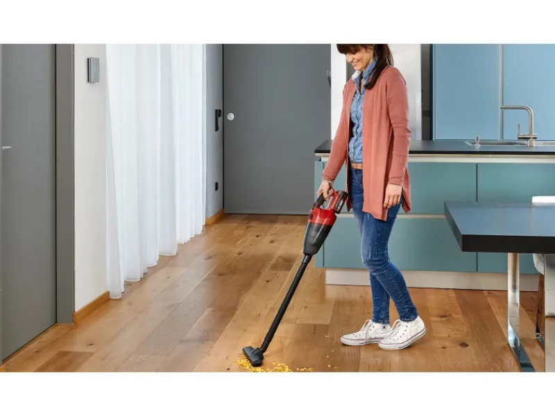 Mit einem geringen Gewicht von 875 g und dem ergonomisch geformten Softgrip ist der Akkusauger besonders handlich. Durch Anbringen des 46,5 cm langen Verlängerungsrohrs kann dieser als Bodenstaubsauger verwendet werden. Der Staubfangbehälter verfügt über ein Fassungsvermögen von 540 ml. Somit ist der Handstaubsauger auch zum Aufsaugen größerer Mengen geeignet. Der Staubsauger wird mit drei Aufsätzen geliefert. Diese sind jeweils für bestimmte Oberflächen vorgesehen. Die Bodendüse ist auf glatte Flächen und Hartböden wie Parkett und Fliesen ausgelegt. Für schwer erreichbare Stellen kann die Fugendüse verwendet werden. Die Polsterdüse ist speziell für Stoffe und Polster geeignet.