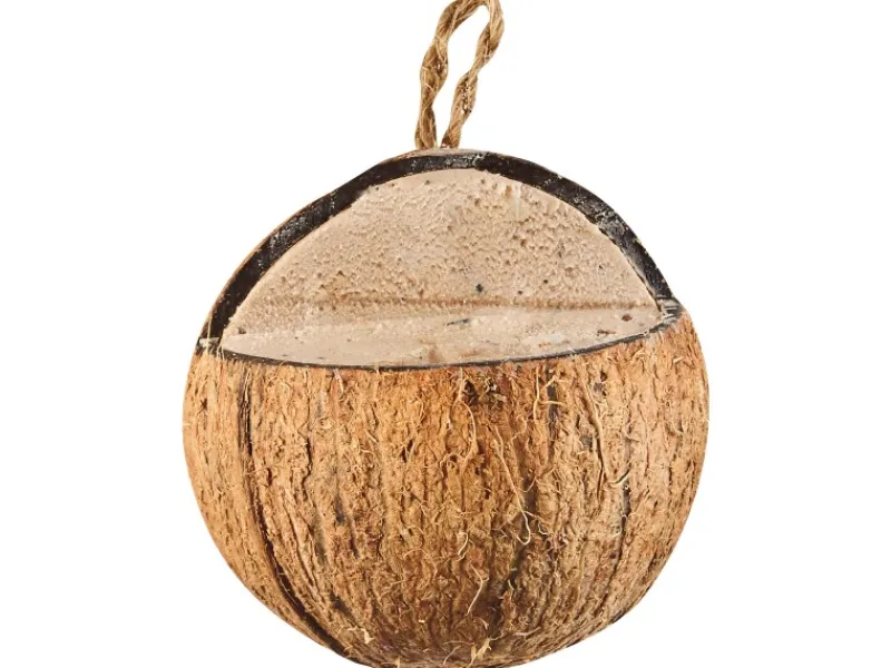 Die leergepickte Kokosnuss kann als Futterschale für Körnermischungen wiederverwendet werden.
