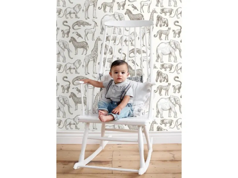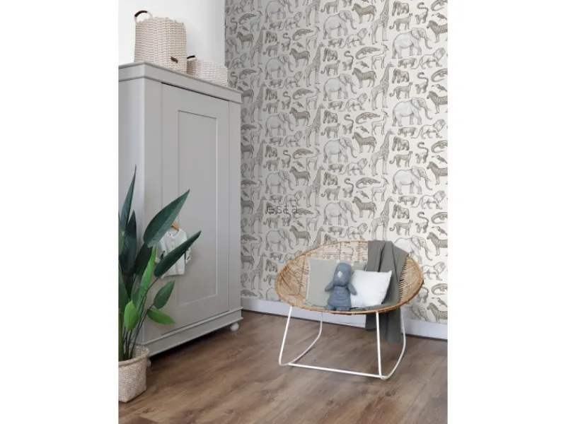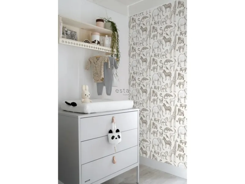 Diese tolle Tapete mit Dschungeltieren in Crême-Weiß verwandelt jedes Kinderzimmer in tropisches Abenteuerland. Kombiniert mit Dschungelkuscheltieren, hellen Farben und natürlichen Materialien, entsteht eine angenehme und freundliche Atmosphäre, die zum Spielen, Toben und Lachen einlädt.Maße, Rapport und Musterversatz Die Maße dieser Tapete sind 53 cm x 10. 05 m (Breite x Länge). Der Rapport ist 53/26. 5 (versetzter Ansatz). Das heißt, dass das Motiv sich alle 53 cm wiederholt und das Muster der nächsten Tapetenbahnen jeweils um 26. 5 cm verschoben werden muss.Tapezieren Das Anbringen dieser Vliestapete ist einfach und unkompliziert: nachdem der Vlies-Kleister direkt auf die Wand aufgebracht wurde, kann die Tapete angesetzt und anschließend glattgestrichen werden. Eventuelle Überstande können mit einem Cuttermesser entfernt werden. Beim Tapezieren wird kein Tapeziertisch benötigt und die Tapete ist auch nach Jahren restlos trocken abziehbar. Für das beste Tapezierergebnis empfiehlt ESTAhome den professionellen Wallpro PRO-301 Tapetenkleister. Vorbereitungstipp: Verhindere Probleme mit der Haftung deines Tapeten, indem du vorher testest, ob deine Wandoberfläche stark saugend ist. Nimm dazu einen feuchten Schwamm und befeuchte einen kleinen Teil der Wand. Wenn der feuchte Bereich innerhalb weniger Sekunden verschwindet, ist die Wand sehr saugfähig. In diesem Fall empfehlen wir, ein Grundiermittel zu verwenden, um die Saugfähigkeit zu verringern. ESTAhome empfiehlt hierfür die WALL PRO-401 Tapetenprimer.Sofort startklar! Am einfachsten ist es, direkt auch der benötigte Tapetenkleister und ein Wallpro PRO-933 Tapezierset zu bestellen. Dieses Tapezierset enthält alle Tapezierwerkzeuge, die beim Tapezieren von Vliestapeten benötigt werden. Diese Artikel können über das Suchfenster auf der Amazon Seite schnell gefunden und bestellt werden. So wird das Tapezieren zum Kinderspiel!