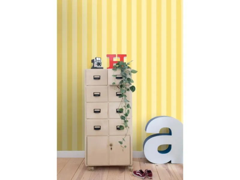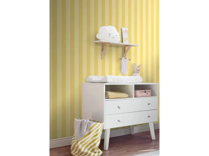 Diese trendige Tapete mit Streifen in Gelb macht jede Wand zu einem echten Hingucker und passt perfekt in einen modernen Einrichtungsstil. Diese Tapete kann sowohl stilvoll mit dunklen, warmen Tönen als auch mit hellen Farben und Hölzern kombiniert werden. Gerade diese Kombinationen sorgen für ein harmonisches Gesamtbild.Maße, Rapport und Musterversatz Die Maße dieser Tapete sind 0. 53 x 10. 05 m (Breite x Länge). Der Rapport ist 0 cm und die Tapete ist ansatzfrei. Das heißt, dass das Motiv sich alle 0 cm wiederholt und das Muster der einzelnen Tapetenbahnen beim Anbringen der Tapete nicht berücksichtigt werden muss.Tapezieren Das Anbringen dieser Vliestapete ist einfach und unkompliziert: nachdem der Vlies-Kleister direkt auf die Wand aufgebracht wurde, kann die Tapete angesetzt und anschließend glattgestrichen werden. Eventuelle Überstande können mit einem Cuttermesser entfernt werden. Beim Tapezieren wird kein Tapeziertisch benötigt und die Tapete ist auch nach Jahren restlos trocken abziehbar. Für das beste Tapezierergebnis empfiehlt ESTAhome den professionellen Wallpro PRO-301 Tapetenkleister. Vorbereitungstipp: Verhindere Probleme mit der Haftung deines Tapeten, indem du vorher testest, ob deine Wandoberfläche stark saugend ist. Nimm dazu einen feuchten Schwamm und befeuchte einen kleinen Teil der Wand. Wenn der feuchte Bereich innerhalb weniger Sekunden verschwindet, ist die Wand sehr saugfähig. In diesem Fall empfehlen wir, ein Grundiermittel zu verwenden, um die Saugfähigkeit zu verringern. ESTAhome empfiehlt hierfür die WALL PRO-401 Tapetenprimer.Sofort startklar! Am einfachsten ist es, direkt auch der benötigte Tapetenkleister und ein Wallpro PRO-933 Tapezierset zu bestellen. Dieses Tapezierset enthält alle Tapezierwerkzeuge, die beim Tapezieren von Vliestapeten benötigt werden. Diese Artikel können über das Suchfenster auf der Amazon Seite schnell gefunden und bestellt werden. So wird das Tapezieren zum Kinderspiel!