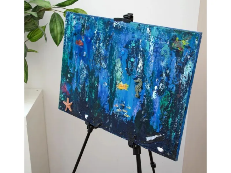 Die Teleskop-Staffelei ist stufenlos verstellbar. Sie können die Höhe der Standbeine bequem verändern und mit den Schraubverschlüssen leicht arretieren. Die robusten Gummifüße geben Ihren Werken Halt – selbst auf unebenem Untergrund.
