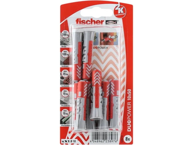 Der Fischer DuoPower bietet sehr gute Haltewerte durch 2 Komponenten: Die graue Komponente aus hochwertigem Nylon aktiviert je nach Baustoff automatisch das optimale Funktionsprinzip (Spreizen, Klappen) für besten Halt. Die Expansionsflügel der roten Komponente unterstützen die sichere Verspreizung und bieten zusätzliche Sicherheit zur grauen Komponente.Einfaches Eindrehen der Schraube und richtiges Ziehen zum Schluss. Kein Überdrehen der Schraube. Der am Dübelkopf angeformten Rand verhindert, dass der Dübel ins Bohrloch rutscht. Der DuoPower ist die erste Wahl bei der Befestigung beispielsweise von Hängeschränke, Wandregale, Spiegelschränke, Werkzeugwände, schwere Spiegel und Garderoben.