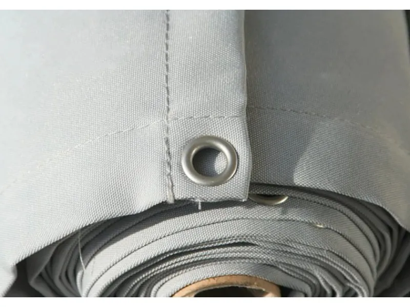 Dank der vorgefertigten Metallösen lässt sich die fertige Balkonverkleidung unkompliziert montieren. Die Ösen befinden sich an beiden Längsseiten, haben einen Innendurchmesser von Ø 10 mm und sind alle 24,5 cm gesetzt. Mit Hilfe der zwei 5 m langen Kordeln in passendem Silbergrau (im Lieferumfang enthalten) lässt sich die Balkonverkleidung einfach am Geländer befestigen.