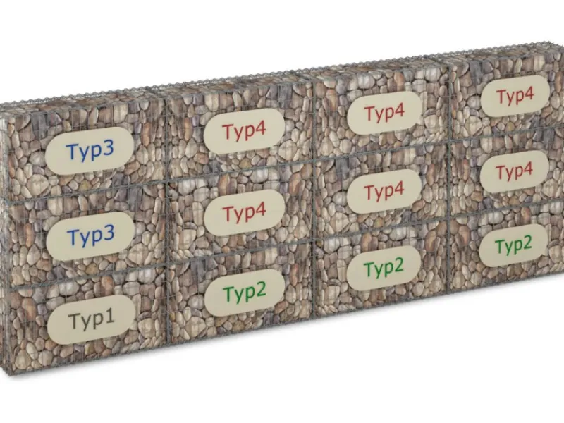 Zur Befüllung geeignet sind: Natursteine, Granitpflaster, Bruchstein oder ähnliches. Generell sind alle Steine mit einer Körnung ab ca. 80 mm möglich.