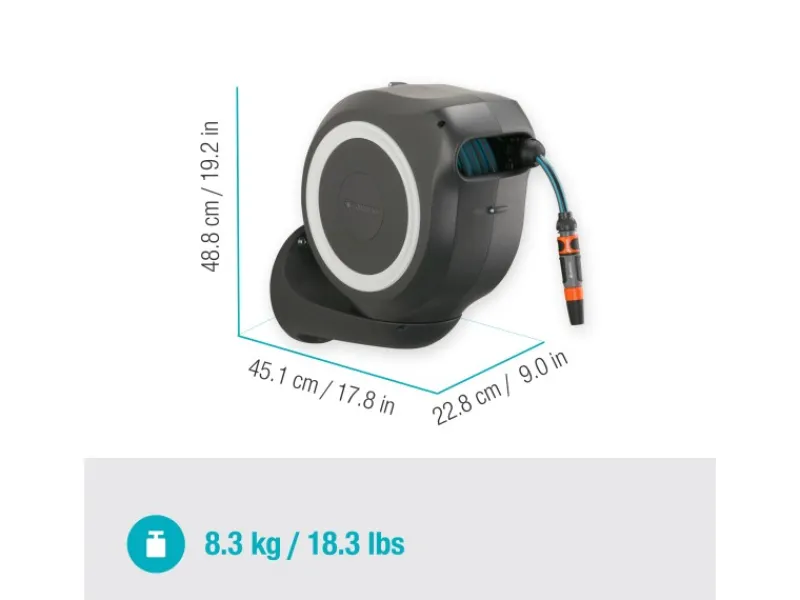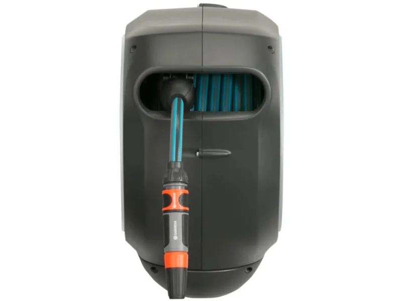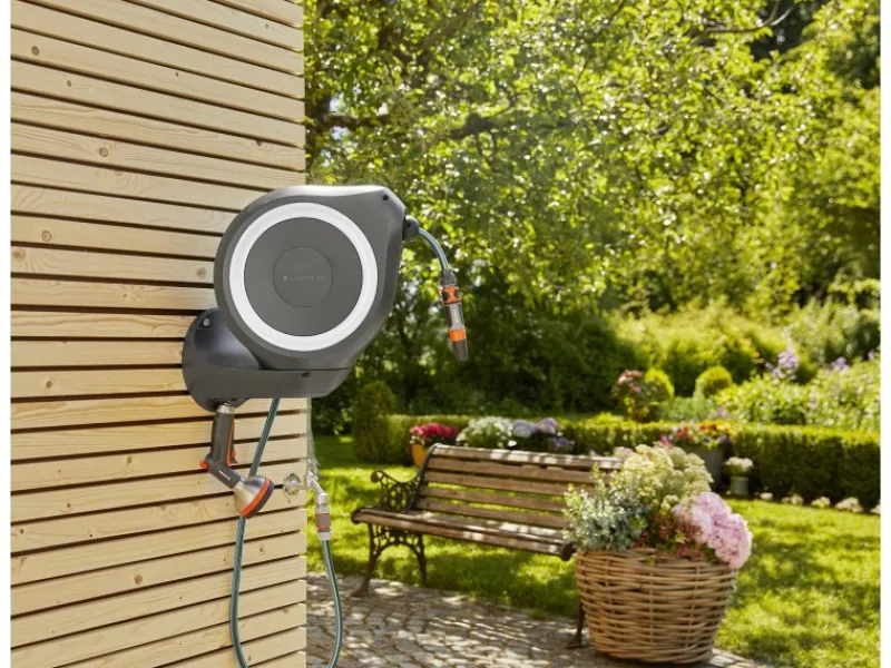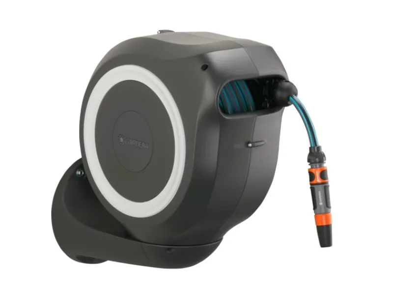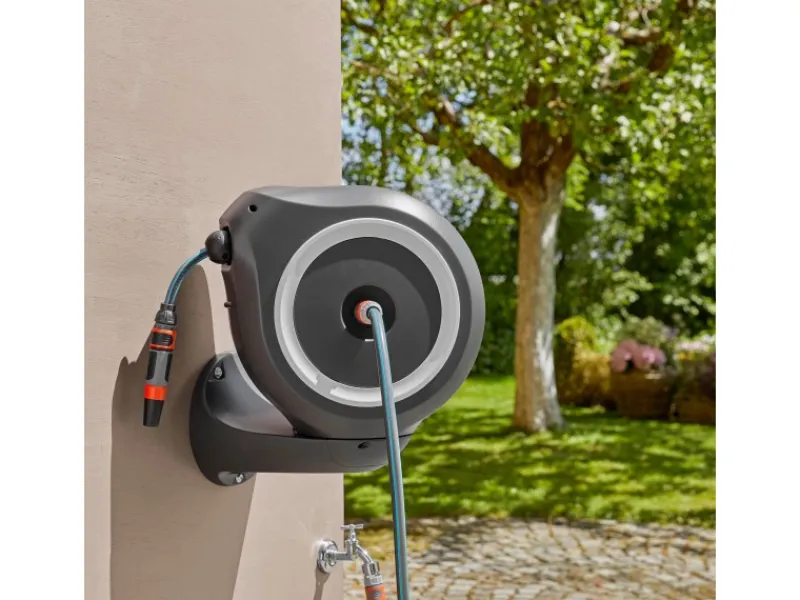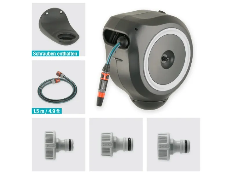 Inkl. Gardena 20 m Schlauch, 1,5 m flexibler Anschlussschlauch, Systemteilen, Spritze und Wandhalterung