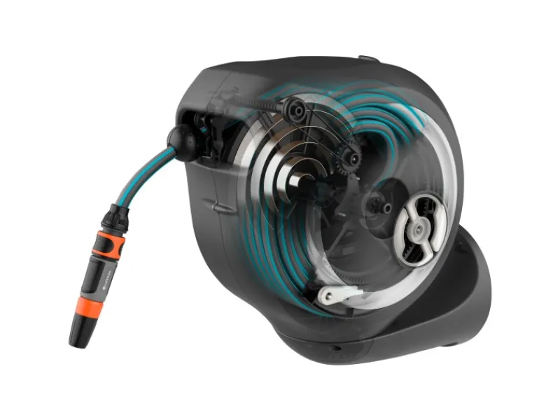 Mit kurzen Arretierstopps kann der Schlauch auf die gewünschte Länge ausgezogen werden. Um den Schlauch wieder aufzurollen, reicht ein leichter Zug am Schlauchende. Die RollControl-Technologie bewirkt ein langsames und sicheres Einholen, egal wie weit der Schlauch ausgerollt ist.