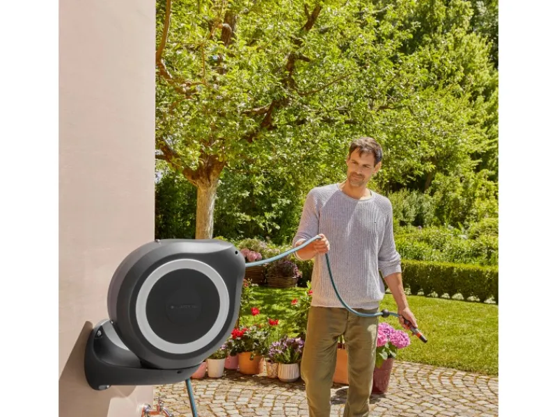 Die Wandhalterung ist um 180° schwenkbar. Dadurch bewässerst du entspannt jeden Winkel deines Gartens, ohne dass der Schlauch abknickt. Nach dem Gießen sorgt die integrierte Schlauchführung für einen gleichmäßigen Einzug, sodass der Schlauch sich nicht verknotet.