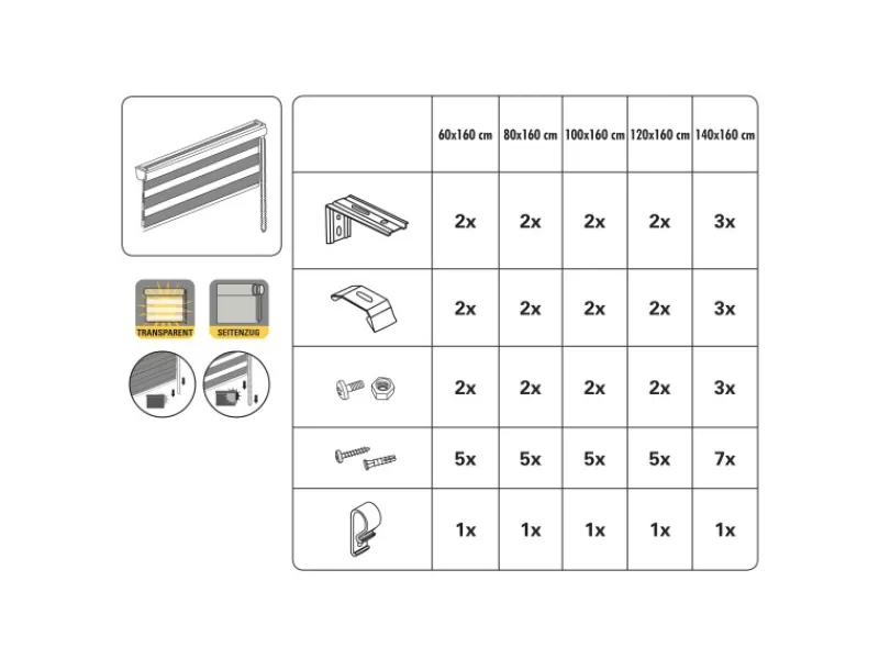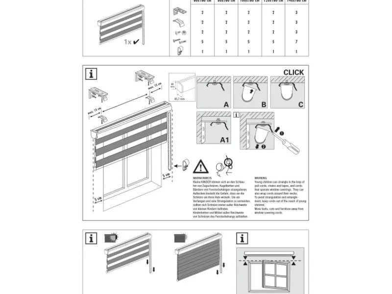 Das im Lieferumfang enthaltene Befestigungsmaterial ermöglicht Ihnen sowohl die Decken- als auch die Wandmontage. Alternativ können Sie das Rollo mit dem passenden Klemmträger auch ohne Bohren und Schrauben auf dem Fensterflügel montieren.