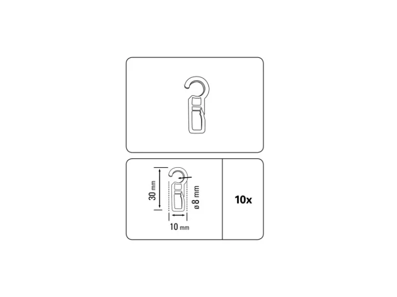 Die Gardinia Faltenlegehaken bestehe aus weißem Kunststoff. Sie haben eine Öse mit Ø 8 mm und können zusammen mit den passenden Gardinenringen verwendet werden. Es handelt sich hier um ein 10-er Pack.