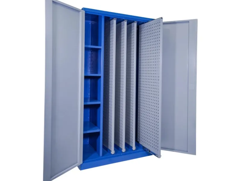 Der Schrank ist mit einer Auszugssperre ausgestattet, um ein versehentliches Herausziehen der Schubladen zu verhindern. Zusätzlich zu den Ausziehschubladen bietet der Schrank 5 seitliche Fächer, die zusätzlichen Stauraum bieten. Dadurch können Sie Ihr Werkzeug übersichtlich und griffbereit aufbewahren.