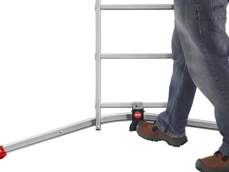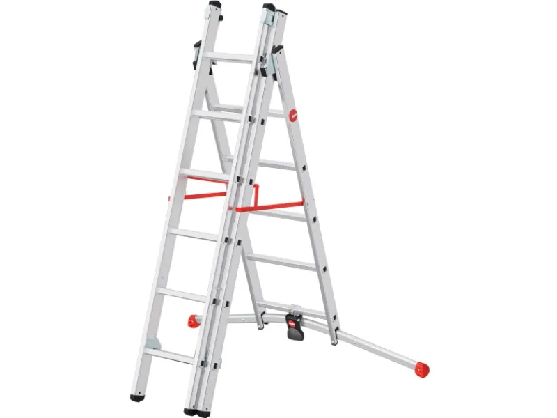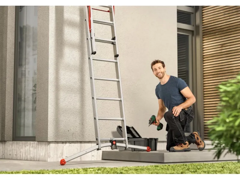 Die Leiter ist vielseitig verwendbar als Anlege-, Schiebe- und Bockleiter. Sie hat 2 Flächenauflage-Steckfüße, 2 standsichere, großflächige Tatzenfüße sowie federunterstützte Rasthaken mit Transportsicherung. Die Leiter ist mit einer Treppenverstellung ausgestattet und bis 150 kg belastbar.