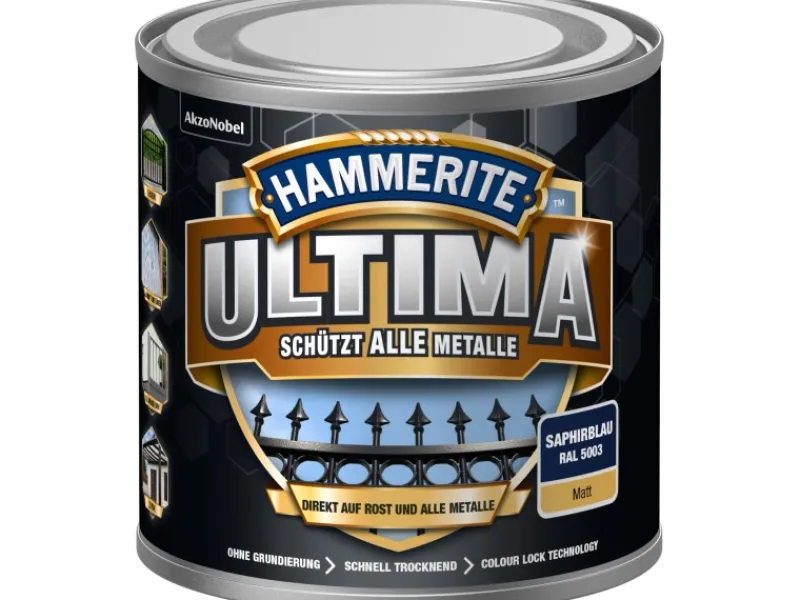 Der Hammerite Metallschutz-Lack Ultima Matt 250 ml Saphirblau RAL5003 schützt alle Metalle und kann direkt auf Rost aufgetragen werden. Der ultimative Schutzlack ist Grundierung und Lack in einem und extrem farbton- und glanzstabil. Hammerite Ultima schützt Gartenzaune, Treppen- und Balkongeländer, Garagentore, Fahrräder sowie viele weitere Metalle im Außenbereich. Erhältlich ist der Lack in 6 RAL-Farbtönen in Matt und Glänzend. Verbrauch: 135 ml / m² pro Anstrich. 250 ml sind ausreichend für ca. 0,9 m², 750 ml für 2,8 m² bei 2 Anstrichen, Trockenzeit: nach ca. 1 – 2 Std. staubtrocken, nach ca. 4 Std. überstreichbar je nach Temperatur und Luftfeuchtigkeit. Die Endhärte und der Glanzgrad des Lackes werden nach maximal 2 Wochen erreicht.