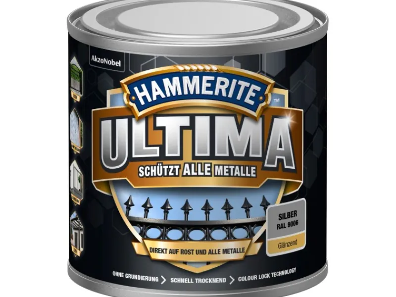 Die speziell entwickelte Rezeptur schützt jedes Metalle vor Rost, ist hochgradig witterungs- und UV-beständig. Hammerite Ultima schützt Gartenzaune, Treppen- und Balkongeländer, Garagentore, Fahrräder sowie viele weitere Metalle im Außenbereich. Erhältlich ist der Lack in 6 RAL-Farbtönen in Matt und Glänzend.