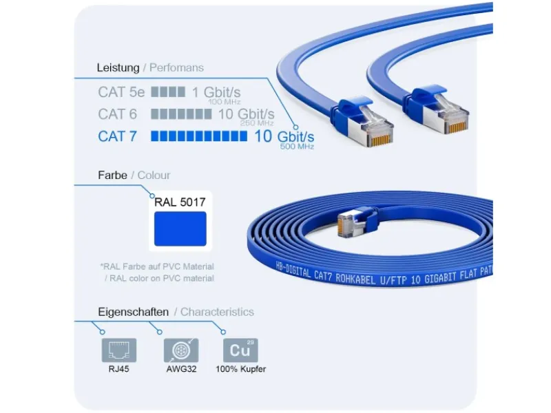 Premium Flaches Patchkabel CAT 7 Rohkabel mit CAT 6a RJ45-Stecker vergoldet