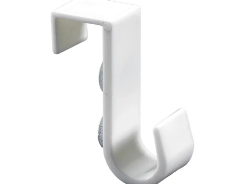 Der weiße Türhängehaken ist aus Kunststoff gefertigt und hat eine Größe von (H x B x T) 70 mm x 22 mm x 50 mm.