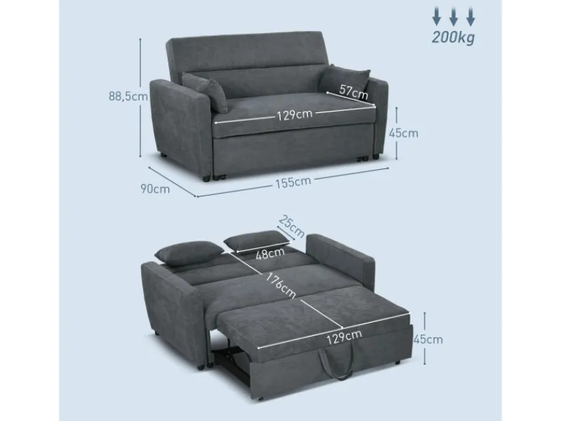 Dieses HOMCOM 2-in-1 Schlafsofa ist dient Ihnen tagsüber als stilvolle Couch und nachts als komfortables Gästebett. Das ergonomische Design und die dreifach verstellbare Rückenlehne bieten optimalen Komfort und unterstützen eine ideale Entspannungshaltung. Geeignet für Wohnzimmer, Schlafzimmer oder Büro – diese Schlafcouch ist ein ganzjähriger Begleiter für entspannte Momente. Genießen Sie jederzeit pure Erholung und bereichern Sie Ihr Zuhause mit diesem vielseitigen Möbelstück.