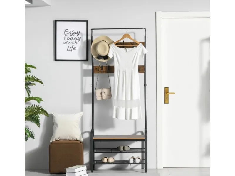 HOMCOM Garderobenständer mit 8 Haken 2 Ablagen MDF Schwarz 72 x 34 x 185 cm