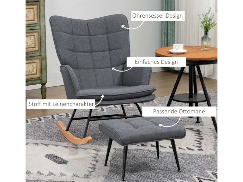 Vermissen Sie den Schaukelstuhl aus dem Haus Ihrer Großeltern? Suchen Sie einen bequemen Sitzplatz zum Stillen oder Fläschchengeben Ihres Babys oder zum Entspannen nach einem langen Arbeitstag? Dann ist dieser fantastische Schaukelsessel von HOMCOM mit passendem Fußhocker genau das Richtige für Sie. Vollständig gepolstert und bezogen, ideal zum Lesen im Wohnzimmer oder für das Kinderzimmer. Gönnen Sie sich diesen Komfort und schaffen Sie eine Oase der Ruhe in Ihrem Zuhause.