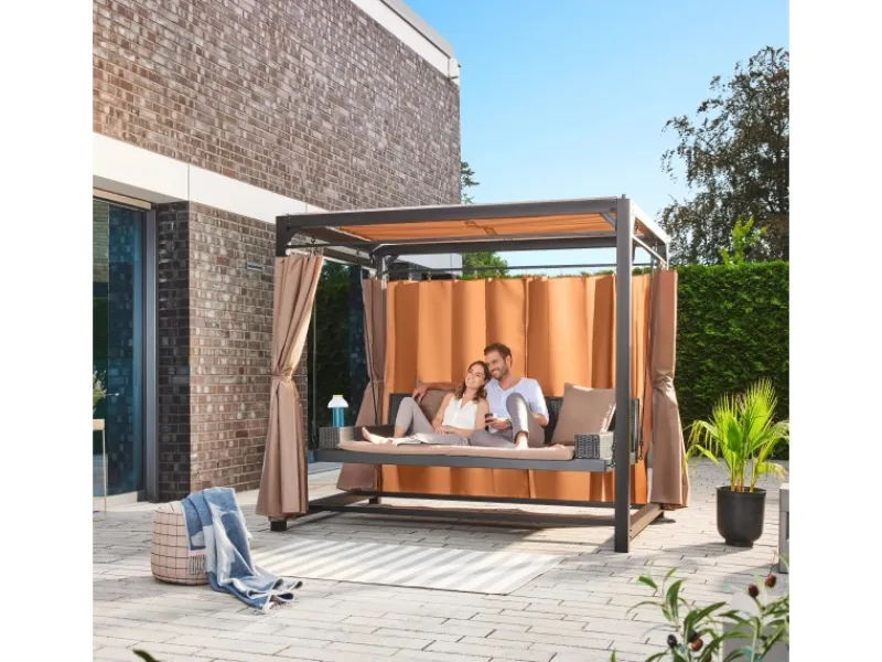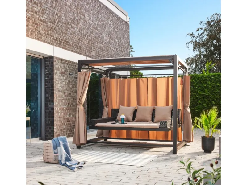 Das Faltdach können Sie bei Bedarf auf- oder zuziehen. So können sie je nach Wetter die Sonne genießen oder im Schatten verweilen. Die dicht gewebten Vorhänge sind aus 100 % Polyester und halten allzu grelles Sonnenlicht sowie Wind ab, damit Sie ungestört relaxen können. Die Seitenwände sind zudem wasserabweisend, sodass Sie bei einem kleinen Sommerregen nicht direkt ins Haus flüchten müssen. Der robuste Rahmen ist aus pulverbeschichtetem Stahl in Schwarz/Anthrazit gefertigt.