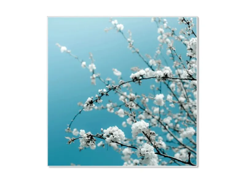 Das Motiv weiße Kirschblüten wird mit einem Schutzlaminat überzogen und ist lösungsmittelfrei.