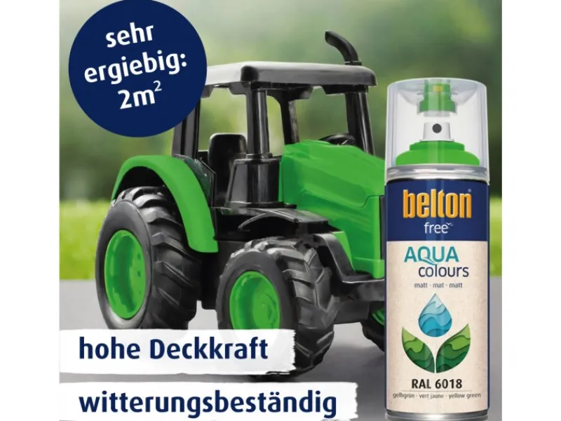 Zu 99% wasserbasierend, geruchsneutral und nahezu ohne Lösungsmittel. Ideal für geruchsensible Bereiche. Witterungs-, UV-beständig und lichtecht. Auf vielen Untergründen, wie z.B. Eisenmetalle, Holz, lackierbare Kunststoffe, Karton, Papier, Stein, Glas, Keramik und Styropor einsetzbar. Verzinkter Stahl, Aluminium und NE-Metalle sind mit Belton Free AQUAprimer Grundierung vorzubehandeln. Kunststoffe auf ihre Verträglichkeit prüfen und bei Bedarf mit Belton Kunststoff-Grundierung vorbehandeln. Belton Free AQUAcolours Buntlack hat eine hohe Deckkraft, trocknet schnell und ist nach DIN EN 71-3 für Kinderspielzeug geeignet. Das Produkt hat eine Sprüh- und Kindersicherung, einen zweiten Sprühkopf sowie einen Farbkennzeichnungsring.